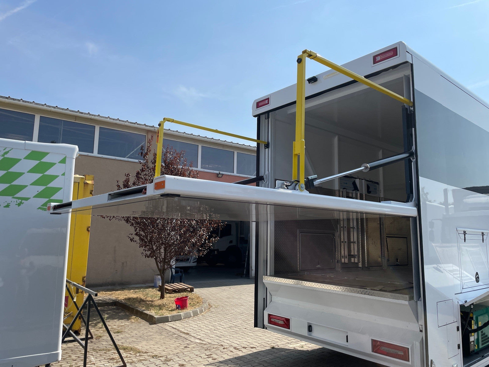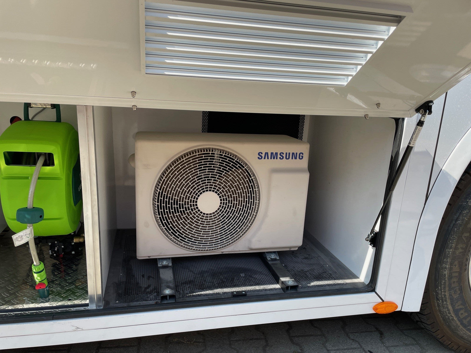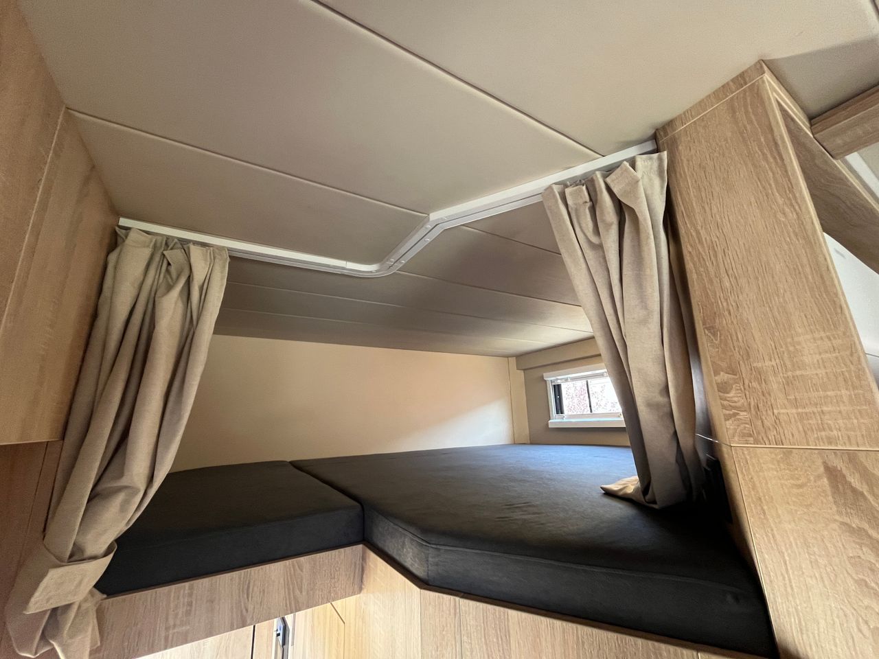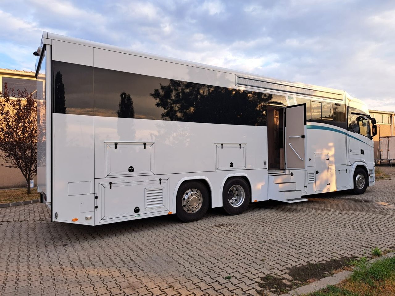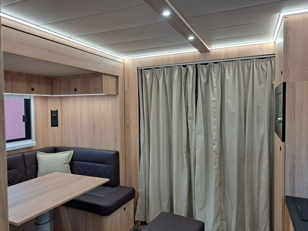 Bilen leveres utstyrt for helårsbruk med fullt kjøkken, registrert for 4 personer. Sengeplass inntil 6 personer. Garasjen er hydraulisk og tar biler inntil 2500kg som gjør at du ikke har noen begrensninger på hva slags personbil / elbil du har med deg. Rullende hytte med både generator, vannbårenvarme og solcellepanel, eller hva du måtte ha for formål.